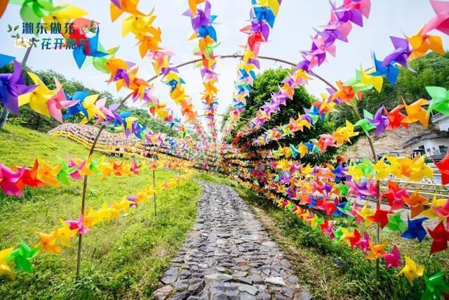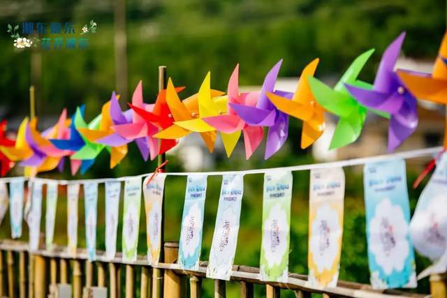 活动现场熙来攘往,盛开的桐花与风车、花旗等装饰相互照应,营造清新自然的氛围感。