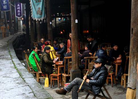 数百年来,罗城古镇的人一直在这不怕雨淋日晒的“凉厅子”下喝酒吃肉、打牌听曲儿、抽叶子烟、掏耳朵,卖狗皮膏药等等,享尽了红尘中的清福。“凉厅子”下原来很多老字号店铺,如今已经消失的无影无踪,取而代之的是各种各样的小食店、理发店、茶馆等等,大概是距离城市较远的缘故,这座古镇至今仍然生活着很多居民,慢悠悠的过着自己安稳的生活。