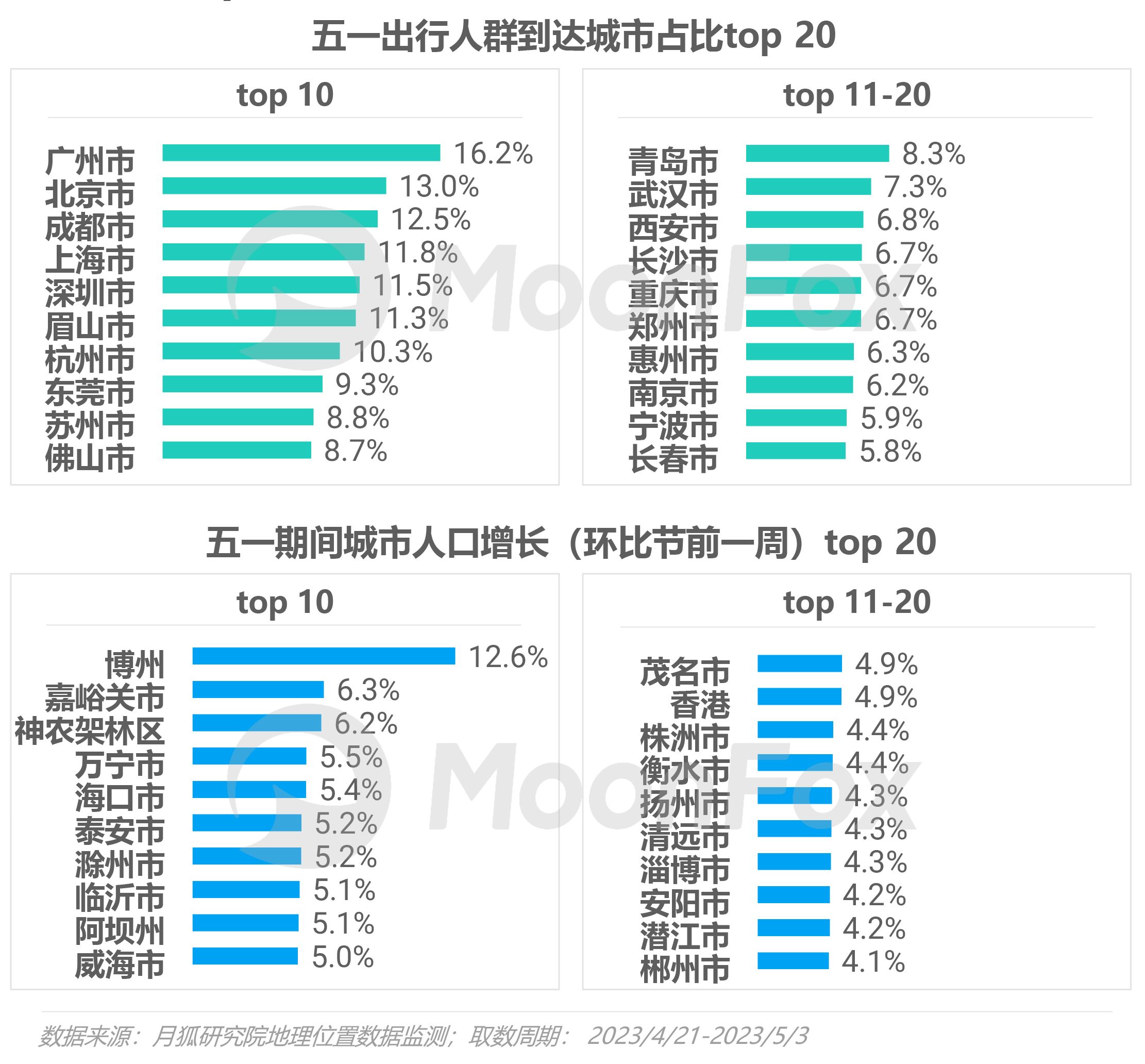 广州、北京、成都、上海等城市五一期间承载最大客流,泰安、临沂、威海、淄博等四个山东省城市上榜五一人口增长top 20城市