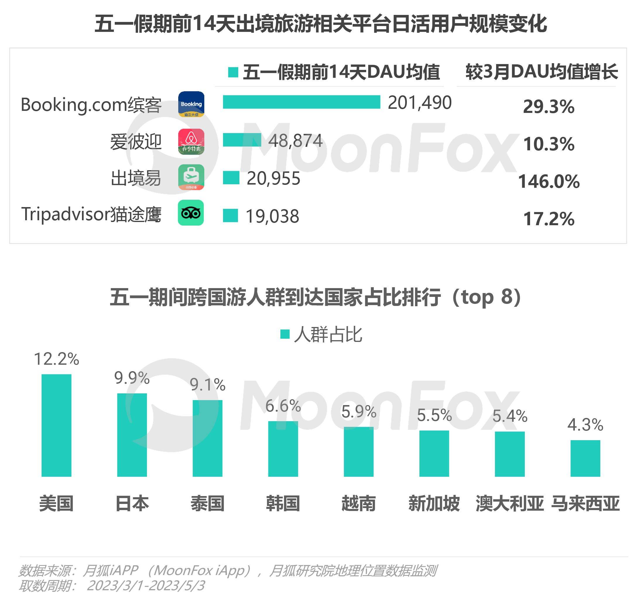 五一出国游热度上升,多款出境旅游相关app日活用户增长明显,美国、日本、泰国旅游热度排名top 3