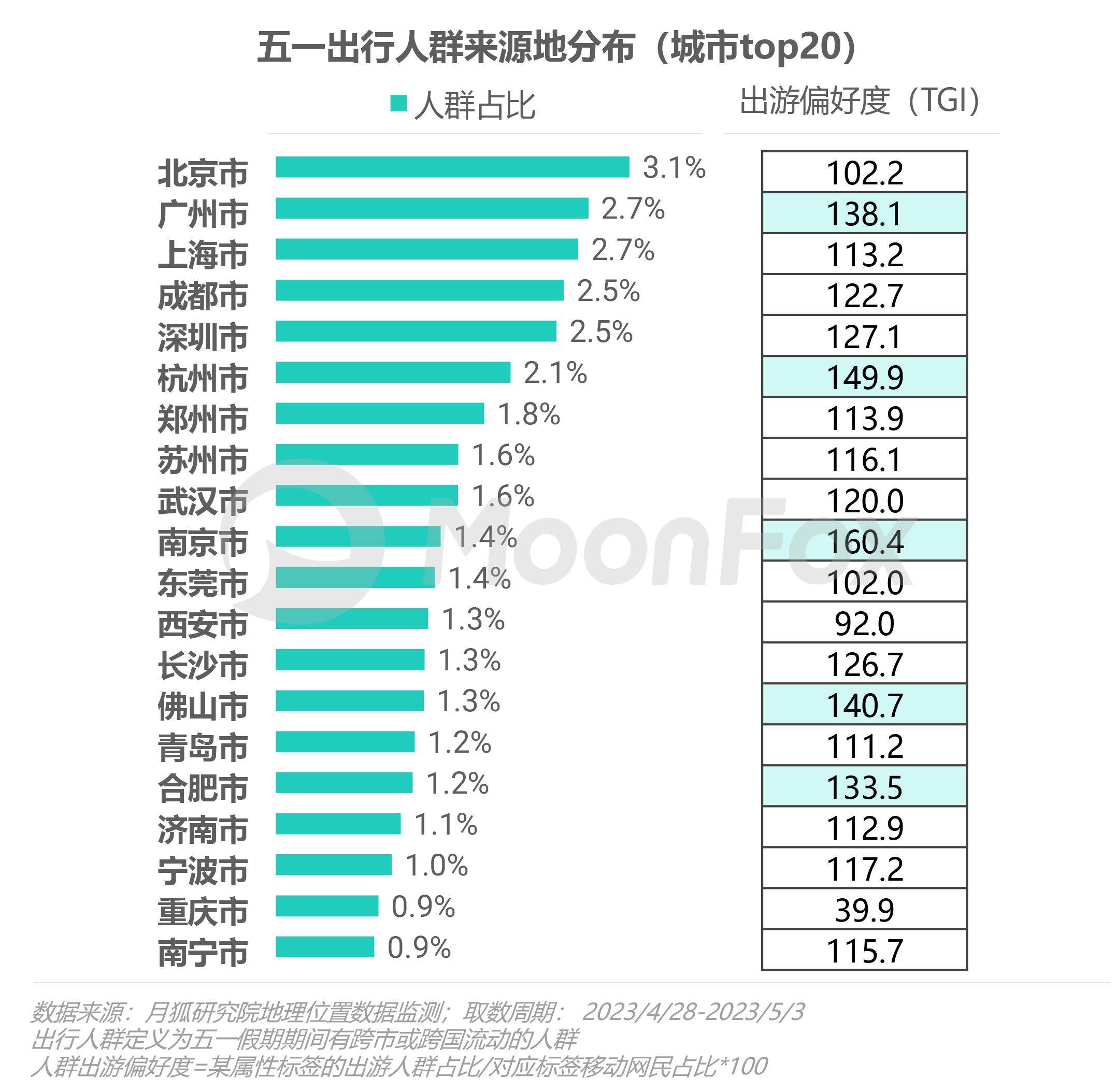 北京、广州、上海等城市五一出行人群占比最大,南京、杭州、佛山等城市人群出游偏好度最高