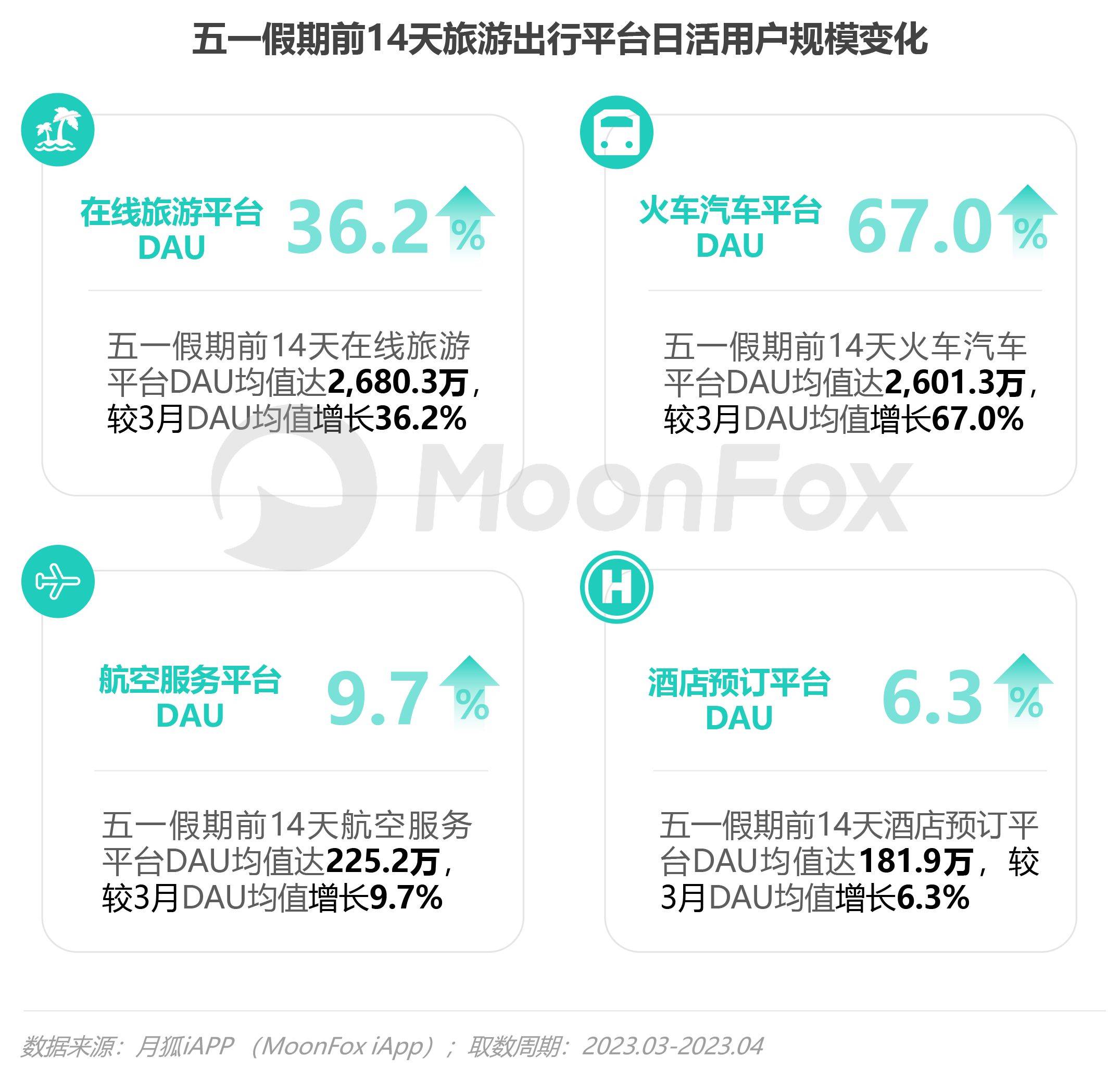 今年五一人群出行热情高涨,假期前两周在线旅游、火车汽车、航空服务、酒店预订等app活跃用户大幅增长