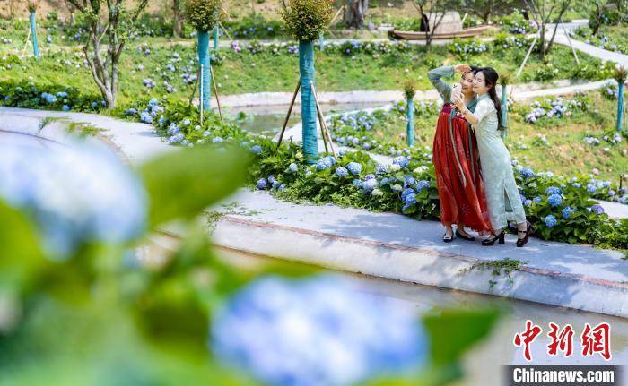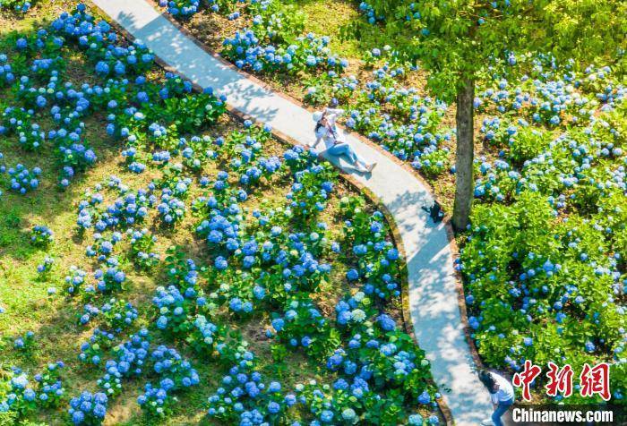 图为重庆巴南绣球花绽放吸引游客观赏。 刘纪湄 摄