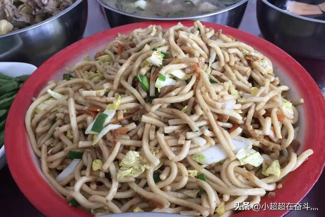大条面除了家乡的饭店,也常常出现在家乡的酒席、宴会上。虽然是一份面食,但是酒席上的大条面绝对是一盘“硬菜”;通过猛火炒制,加上荤素配菜,油滋滋的一盘大条面成了所有宾客的“抢手货”。酒席上纵有山珍海味,也掩盖不了大条面的光芒,大多数时候它便是席上的主食,一大盘子的大条面很快就会被吃光。