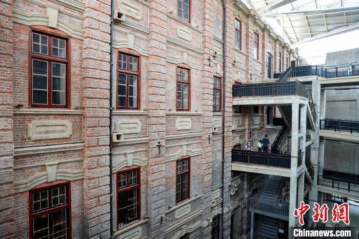 进入厂房内部,红砖墙面、铁质楼梯、粗大的蒸汽阀门、长长的货物滑道……近代工业风气息扑面而来,园区咖啡店、文创书店、艺术展览等,则展现出现代时尚与古老建筑的碰撞、共融新生。