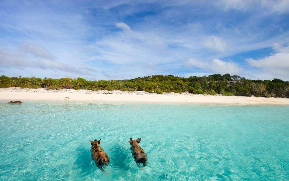 10.巴哈马群岛,猪沙滩,也被称之为猪岛、马若尔珊瑚礁,是巴哈马一座无人居住的小岛,目前则因生活有众多会游泳的野生猪而闻名世界,这些会拥有的小猪走红。猪沙滩生活着一群世界上最幸福的猪,它们可以在碧蓝的海水里畅游,在海滩晒太阳休息,或者与游客拍照留念,显然是岛上的明星动物。这座无人居住的小岛之所以游泳小猪众多,据说是因为它们的祖先是路过的水手们遗弃于此的。每年都有大批游客被这些特色主人吸引前去游玩,这些猪会与游人一起游泳,并会讨要食物。