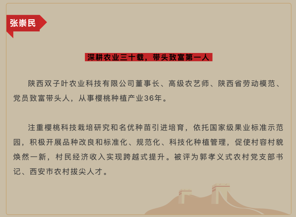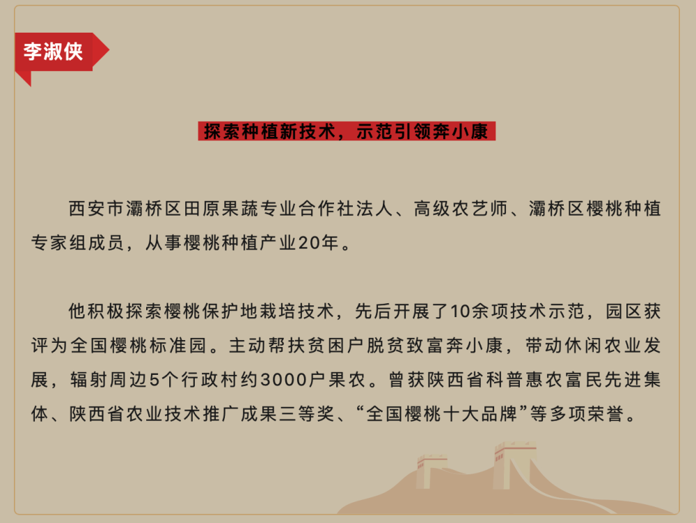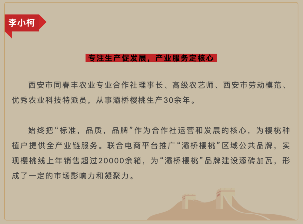 在乡村振兴建设进程中,涌现出了一批又一批勤勉、优秀、有担当的带头人物。他们在灞桥樱桃种植、引进、生产、销售、检测等领域均做出显著成果,积累了典型做法和先进经验,对深入推进农村精神文明建设,推动乡村振兴全产业链发展作出了突出贡献。