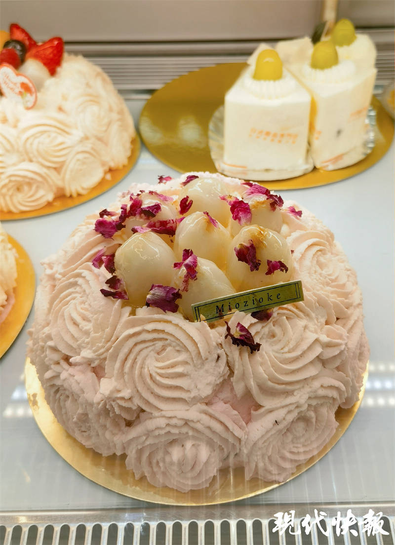 南京新街口的一家蛋糕店最近推出了一款荔枝玫瑰蛋糕,粉色的蛋糕被几颗晶莹剔透的荔枝点缀,少女心满满。店员介绍,这款蛋糕是母亲节前夕刚上市的,4寸的128元,6寸的238元。除了蛋糕顶端的几颗荔枝,蛋糕的夹层也有荔枝肉。“刚推出一周,网红应季水果做的蛋糕也很应景,最近有不少顾客来咨询、订购。”