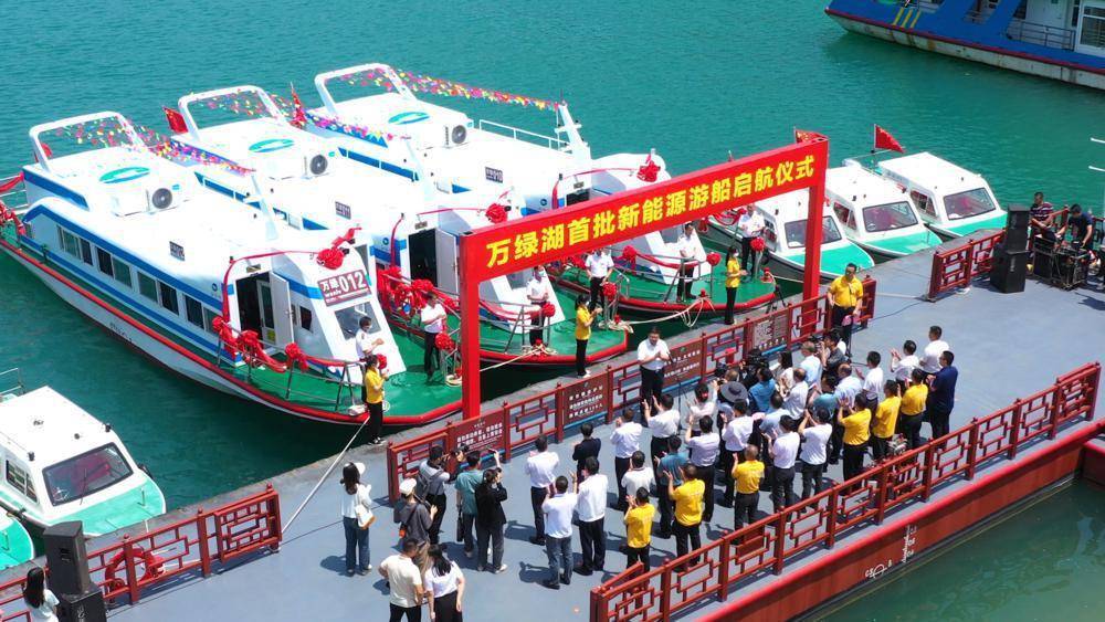 5月15日上午,随着三声响亮的游船汽笛声响起,河源万绿湖风景区首批新能源电动游船启航,这也标志着万绿湖风景区运营游船进入新能源时代,开启生态保护新里程。
