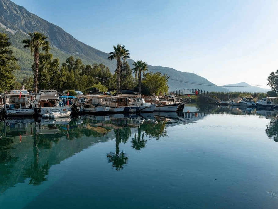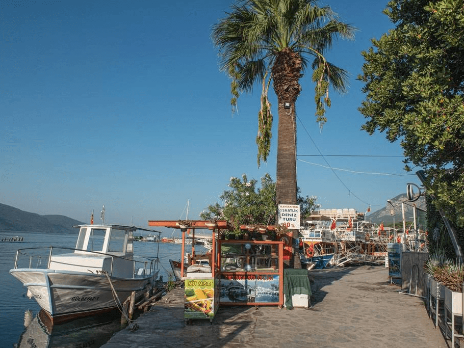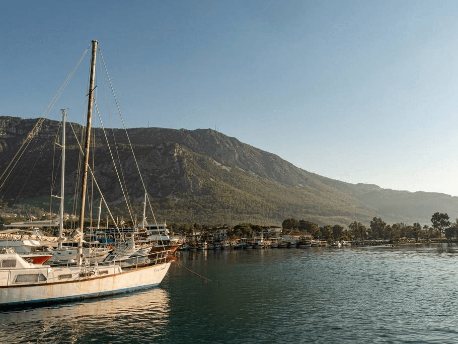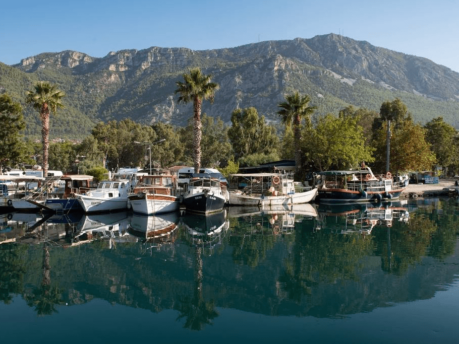 土耳其里维埃拉Akyaka,船只停泊在该海滨小镇的美丽港口。