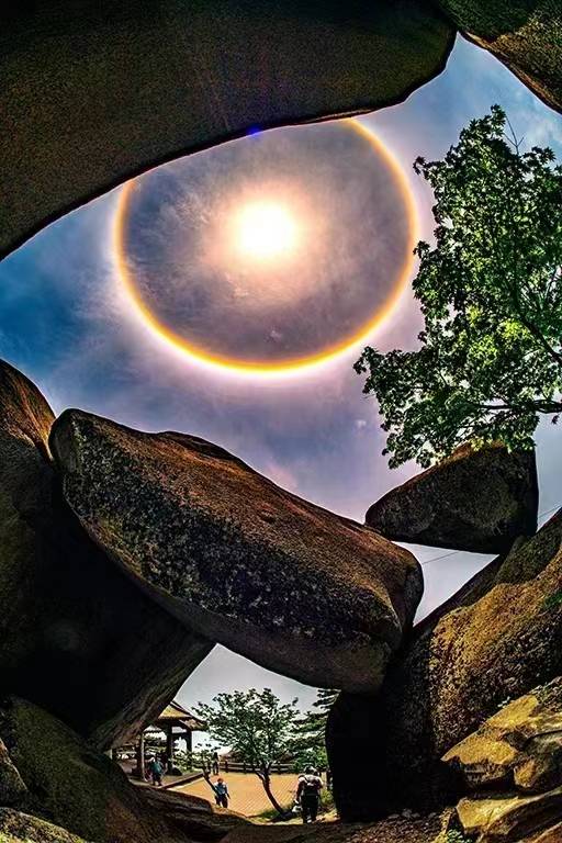 5月13日上午,安徽天柱山景区天气晴朗,云蒸霞蔚,放眼望去,群峰竞秀,峰峦叠嶂,恍若仙境。突然,万里碧空出现罕见的日晕奇观,在太阳的四周出现了一个偌大的彩色光环,绚丽无比,与天柱群峰、怪石交相辉映,非常的壮观唯美。游客们惊叹不已,纷纷停下脚步,拿出手机、相机观赏拍照。