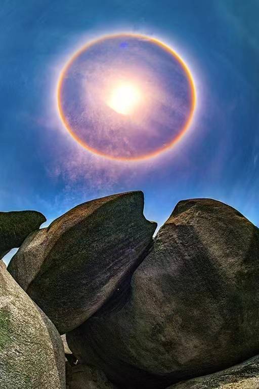 据了解,日晕,又叫圆虹 ,是一种大气光学现象,由悬浮在云层中的冰晶,把太阳光折射、反射而形成。当光线射入卷层云中的冰晶后,经过多次折射、反射,形成了不同颜色、不同方向的光影。一般来说,日晕出现,往往预示着天气将会发生变化,民间也有“日晕三更雨,月晕午时风”的谚语。天柱山由于海拔高,时常会出现云海、佛光等气象奇观,美不胜收。(文:许一君,图:张永富)