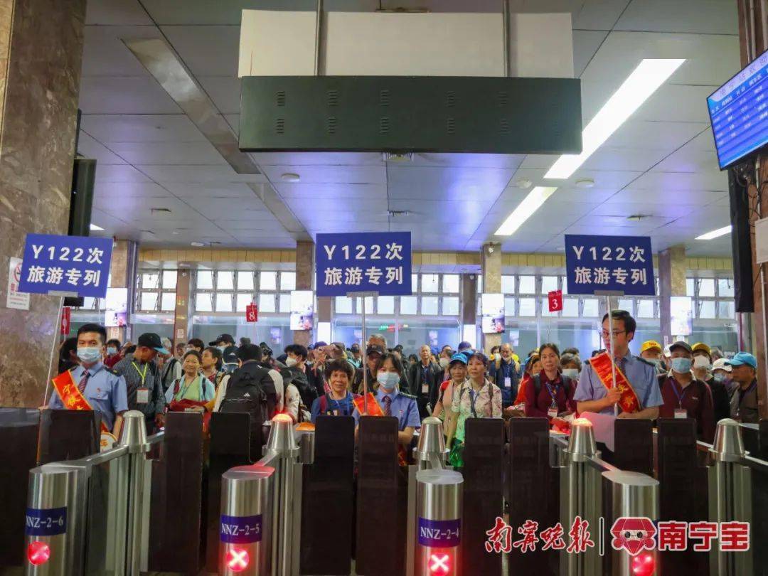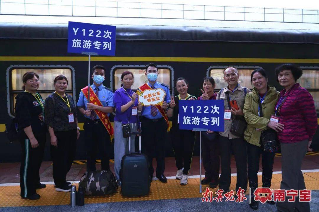 5月13日19时,Y122次“闯关东·看草原”主题旅游专列载着432名中老年游客, 从南宁站缓缓驶出,一路向北前往山海关、盘锦、哈尔滨、漠河、海拉尔等地区,开启为期17天的东北全景休闲之旅。这是今年广西首趟跨省长线旅游专列,服务旅客错峰出游。