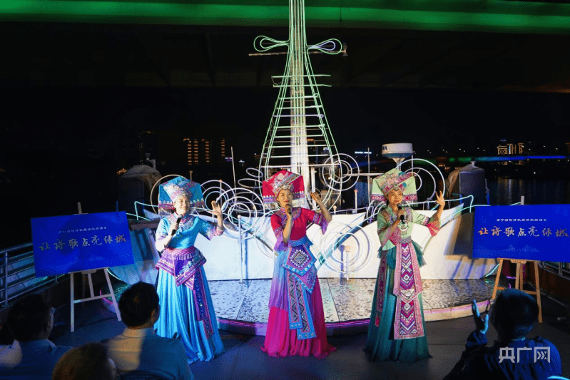 水上音乐诗歌朗诵会是2023南宁国际诗歌周系列重要活动之一,设置“诗歌+游览”双重融合体验环节,举办赏邕江夜景、歌舞表演、诗歌朗诵等丰富多彩的活动。开场节目《原生态迎宾歌》拉开了水上音乐诗歌朗诵会的帷幕,配乐诗朗诵节目《仙鹤》《森林小屋》《出生地》《草原》等引来观众阵阵叫好声,独唱《明月几时有》、器乐表演《茉莉花》等特色表演也一并在游轮上呈现,朗诵声、歌声在邕江上空荡漾。