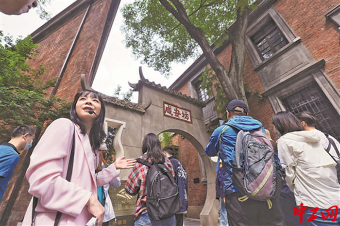 5月13日,湖北武汉江岸区,志愿者正在为游客讲解石库门建筑群——咸安坊。
