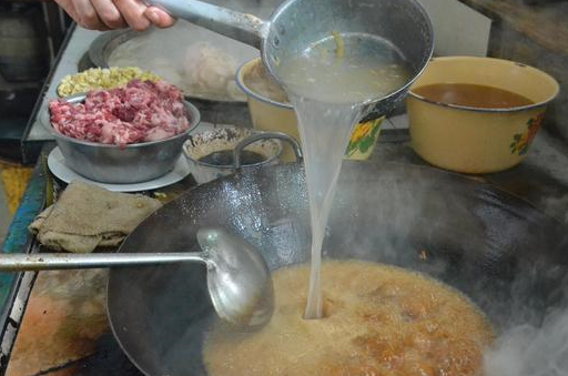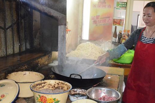 肉在锅里翻炒片刻,胡大姐抄起铁瓢从旁边的大铁锅里舀几瓢羊肉汤进锅里,汤与热油相遇,立刻爆出“刺啦刺啦”的声响,同时炝出诱人的香味,让人对即将出锅的面充满了期待。