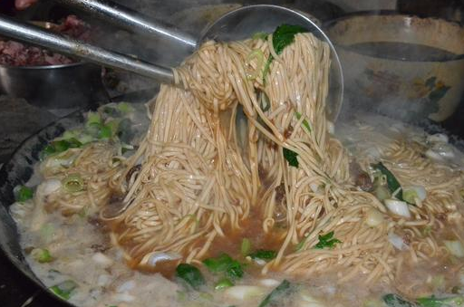 羊肉汤是热汤,所以汤下锅即可下面,只见胡大姐抱来一团鲜面条下到了锅里,这一锅可以做上五六碗,一碗半斤面条,分量不是一般的足。