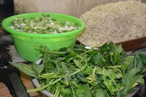 在锅灶旁边的案板上,放着做面用的各种食材,面条是现吃现轧的,一天要轧上两百多斤才够用。青菜分季节选用不同的品种,一般春冬用菠菜,夏秋用小白菜,因为饭店坐落在乡村里,所以羊和青菜都是自己养和种的。