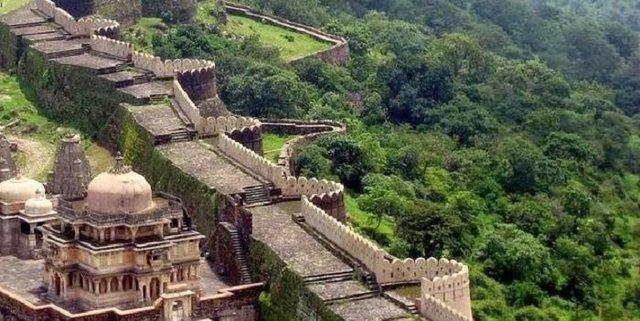 这座“印度长城”名叫昆巴哈尔堡,与故宫一样同属于世界上最大的综合建筑群,这座堡垒建于15世纪,城墙高度约4-6米不等,其外围共40余个烽火台,横亘84公里。在加上城墙与当地的山形地势互为依托,形成了防护严密的环形工事。是当时印度最著名的军事堡垒。