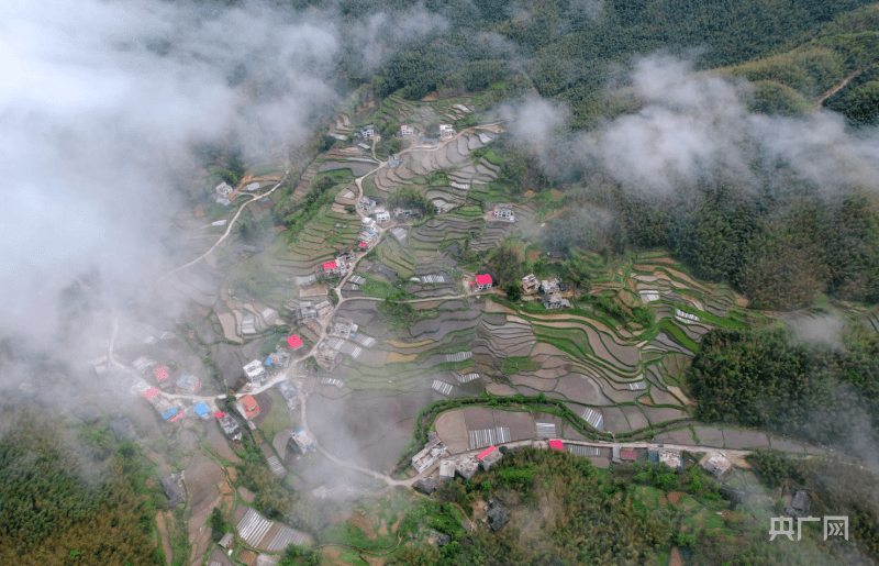 从高处俯瞰,白色的云海在耸立的群峰间翻腾涌动,云在山间绕,山从云中出,时而聚拢,时而消散,云雾沿着山脊攀升翻越,纵横交错的山间公路蜿蜒曲折伸向远方,星罗棋布的梯田、瑶家民居镶嵌其间,田园和村庄在云雾中时隐时现,恍若仙境。
