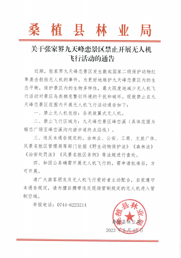 近期,张家界九天峰恋景区发生数起国家二级保护动物红隼袭击航拍无人机的事件。为更好地维护九天峰恋景区内的生态平衡,保护景区内的生物多样性,最大限度地减少无人机飞行活动对景区鸟类栖息繁衍环境的干扰和破坏。现就禁止在九天峰恋景区范围内开展无人机飞行活动通告如下: