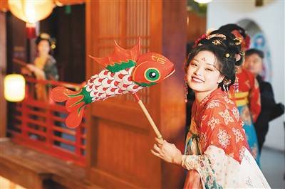 游客在西安“长安十二时辰”主题街区内拍照游玩。