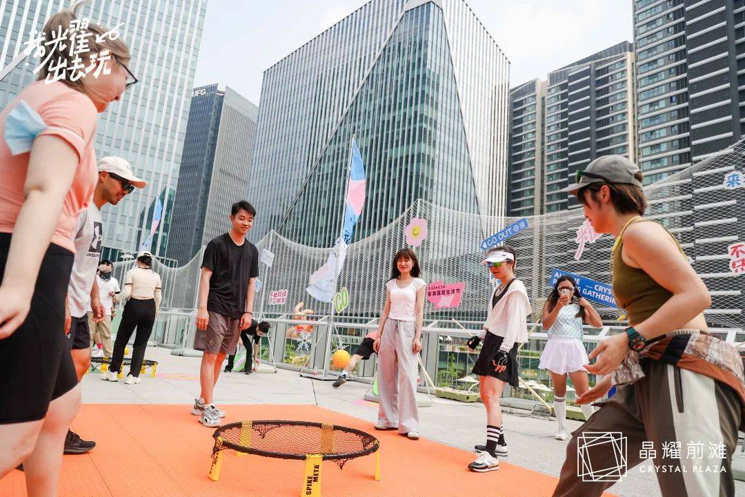得益于前滩板块内独有的公园、绿地等天然近邻滨江的区位优势,晶耀前滩联合东方体育中心月亮湾水上运动公园开展浆板体验专场活动,联合骑行社群与匹克球运动社群合作开展了多项趣味互动体验,并在场内设置了羽毛球、布袋球等多个运动互动区域,让大众能够领略到更多样化、趣味化的户外运动生活方式。