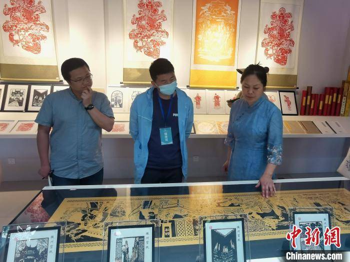 安徽省非遗徽州剪纸传承人吴笑梅(右一)在介绍自己的作品。 张强 摄