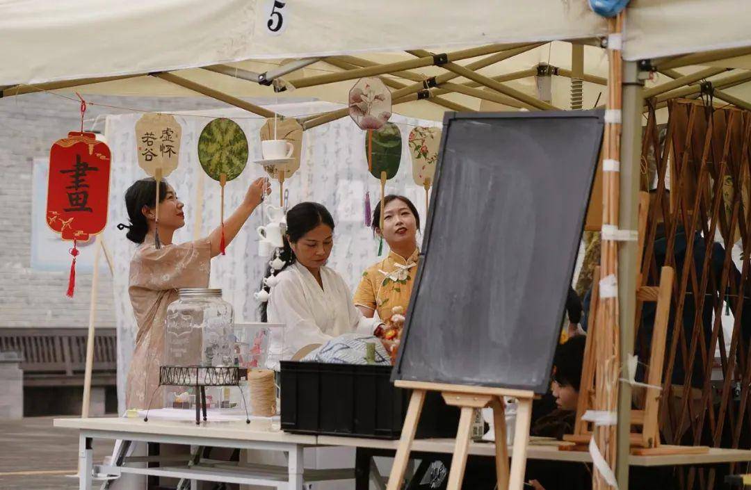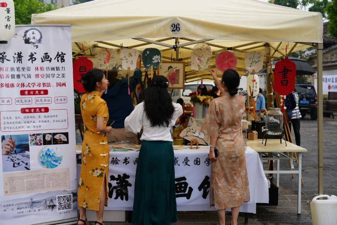 此次“古风茶话集市及古风游园会”活动分为集市区和沉浸式体验区两个区域。集市区从董官村入口至西董花园门口,设有文化创意、文创产品、手工艺品、陶瓷工艺、书法绘画、鲜花绿植、咖啡果汁、蛋糕奶茶、特色服饰、潮流手办、特色小吃等共54个摊位。