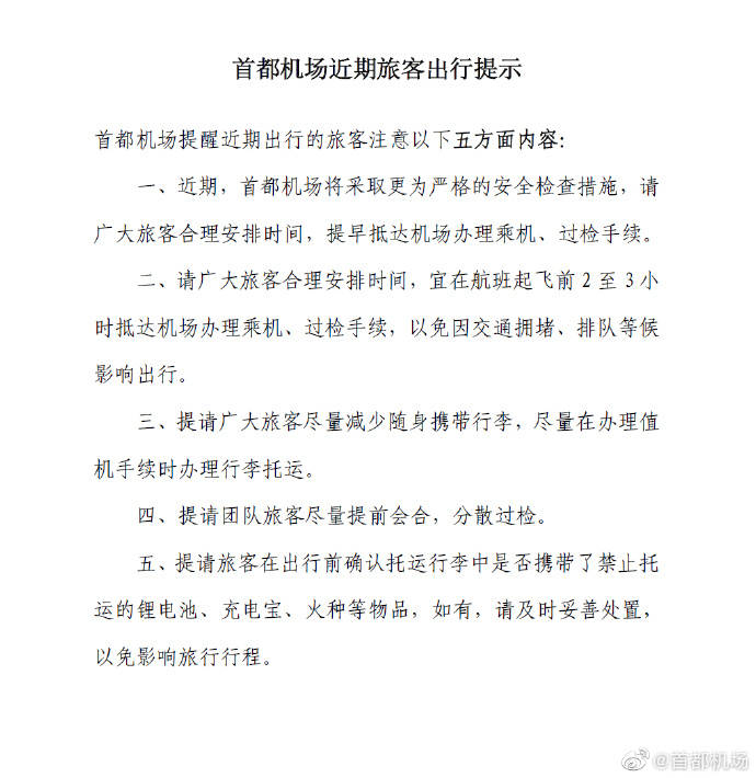 一、近期,首都机场将采取更为严格的安全检查措施,请广大旅客合理安排时间,提早抵达机场办理乘机、过检手续。