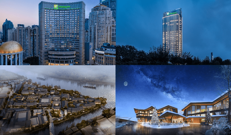 左上:上海南京路步行街假日酒店,左下:德清新市古镇假日酒店,右上:西安浐灞假日酒店,右下:喀纳斯禾木假日度假酒店