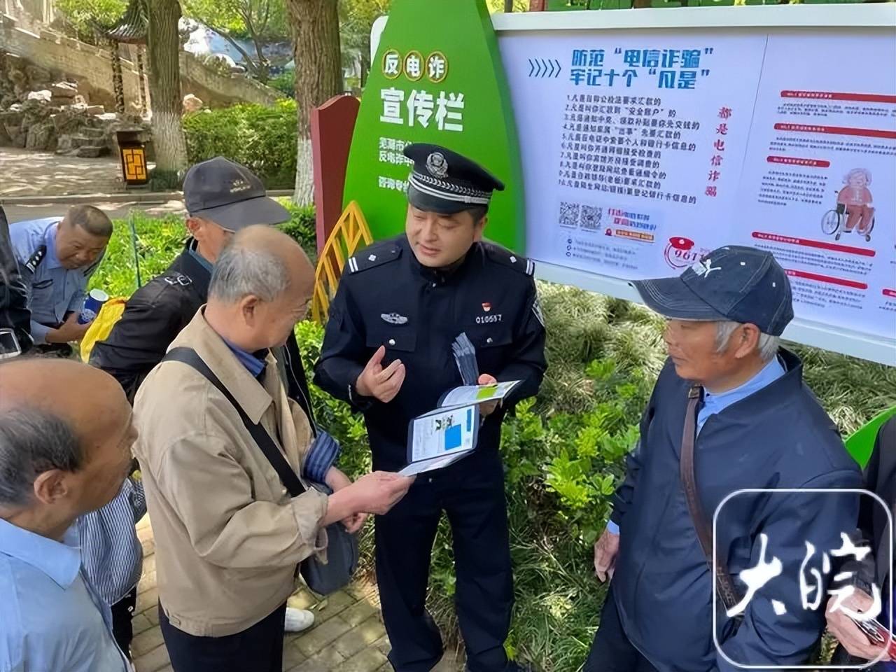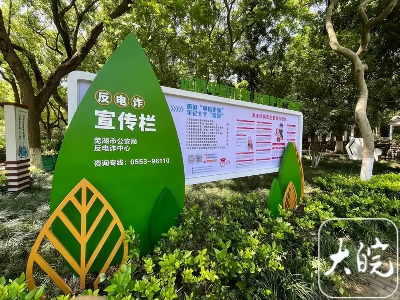 5月9日上午,在芜湖市赭山公园内一角布满了反电诈元素的雕像、标语以及卡通人物,吸引了不少市民前来打卡。