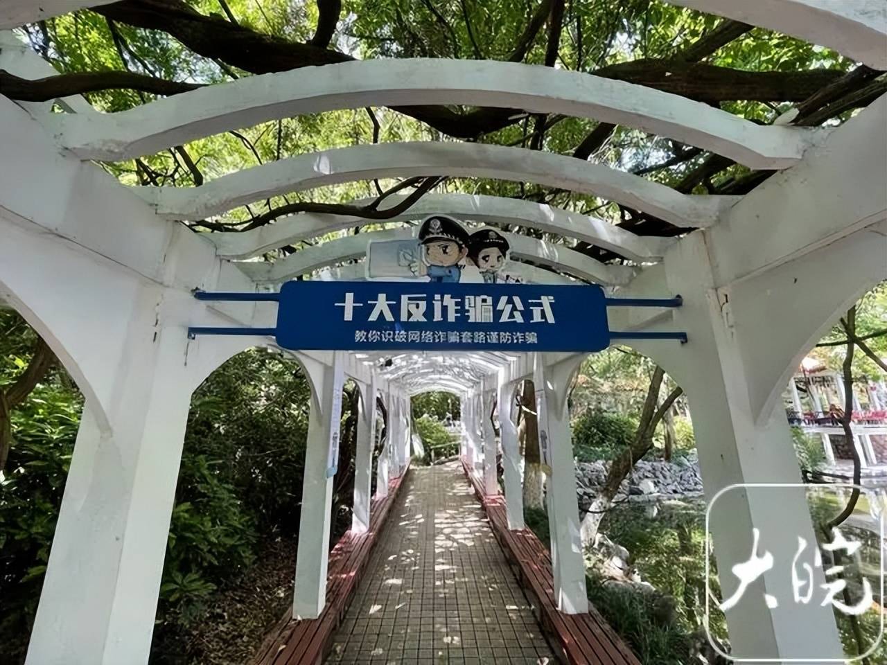 反诈广场树立了《中华人民共和国反电信网络诈骗法》和《防范电信网络诈骗知识》的宣传栏,并选取了“青松”“香樟”“铜牛”作为“反诈卫士松”“全民反诈树”和“社会诚信牛”。邻近反诈广场的是“藤蔓缠绕的长廊可避雨,十大反诈公式能防骗”的反诈知识长廊。为增强公园的互动性,设置了“全警反诈”系列卡通人物和反诈小知识地格,让群众为反诈代言,为正义亮相,在娱乐中接受宣传教育。