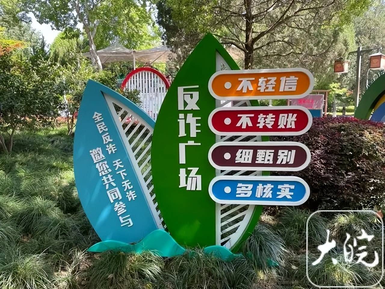 该主题公园由“主题雕塑、反诈广场、知识长廊、我为反诈代言打卡点”四部分构成,选择了宁静和谐的绿色作为主色调,用沉浸式的宣传方法,让广大人民群众在休闲健身之余,潜移默化地了解电信诈骗的手段、种类,构筑“全社会反诈”屏障。