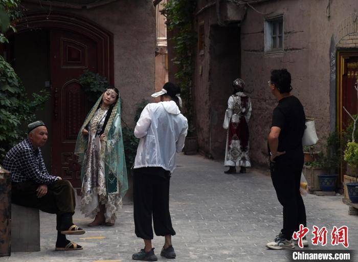 中新网记者在喀什古城阿热亚路一处网红打卡点,看到旅拍的游客需要排队,经验丰富的摄影师们则“见缝插针”拍摄,还不时相互询问“我是不是妨碍你拍摄了?”