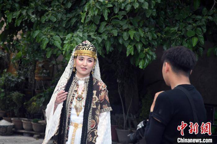 图为旅拍店工作人员在喀什古城里为游客进行拍摄。 孙亭文 摄