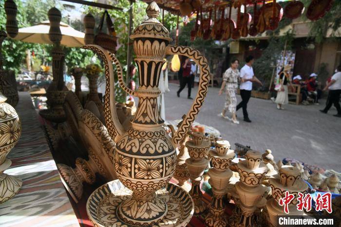 喀什古城里特色的民族乐器、铜器、玉器、服装服饰等,这些有着浓郁“喀什风味”的手工艺品,成了喀什古城里吸引游客的一大亮点。艾山玉山木器店已在喀什古城开设多年,店主玉山江·玉素因告诉中新网记者,他主营木碗、木盘、木勺以及各色乐器。木器多用白杨、泡桐、核桃树、柳树、杏树、枣树、桑树等为原料,用工具刮削成型,最后刻绘花纹、图饰,颇受游客的欢迎。