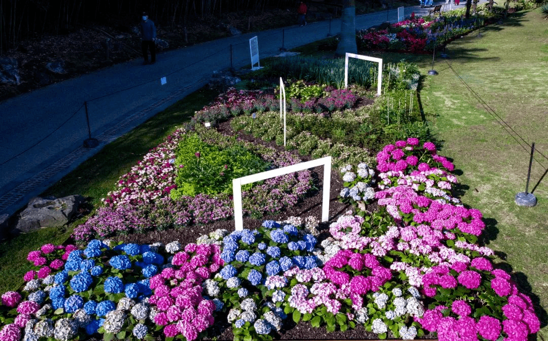 “定格美好”运用三个相框把绣球、芍药、洋水仙、康乃馨等新优花卉的美好定格在记忆里。结合各植物特点采用花带布置手法,营造暖春焕新季的景象,定格美好瞬间。
