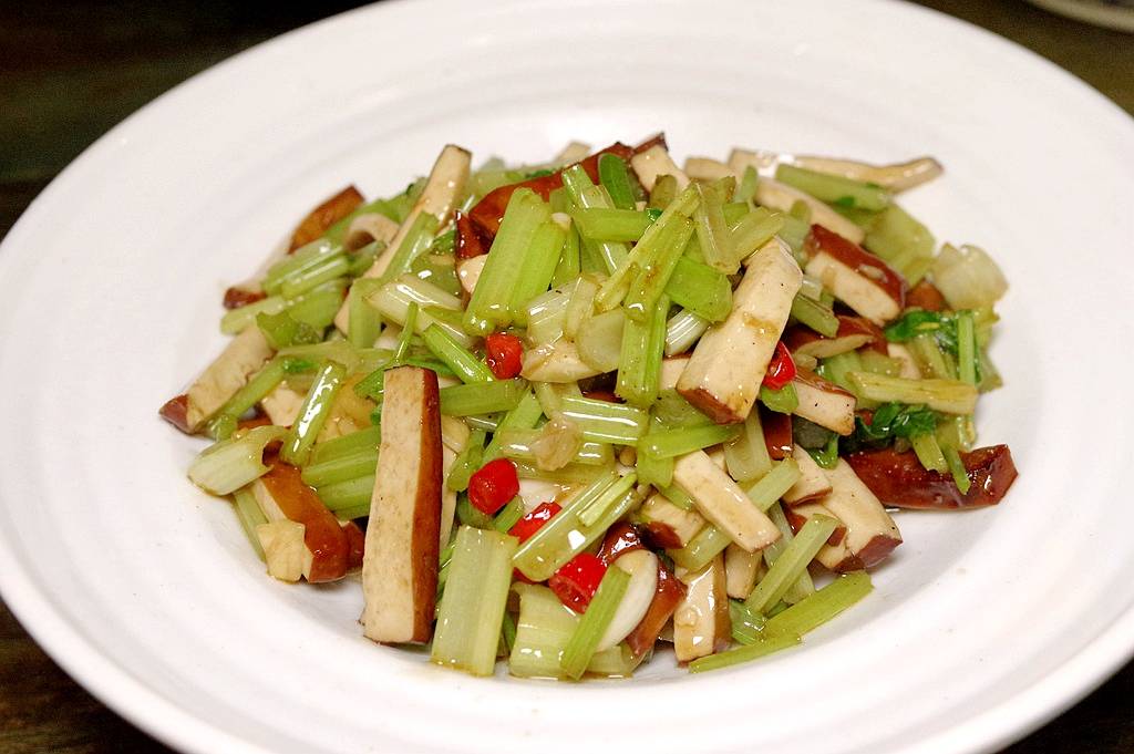 毛芹炒香干:千真万确,小黑板上手写的菜单就是这名字。毛芹也许就是湖北对土芹菜的称呼,想象一下西芹粗壮的体格,立刻觉得俚语往往有传神之妙。虽然这道菜里用的芹菜还不够幼嫩,但土芹菜的清香味是有的,搭配香干,炒得清清爽爽,一点也不拖油带水,意外的好吃。