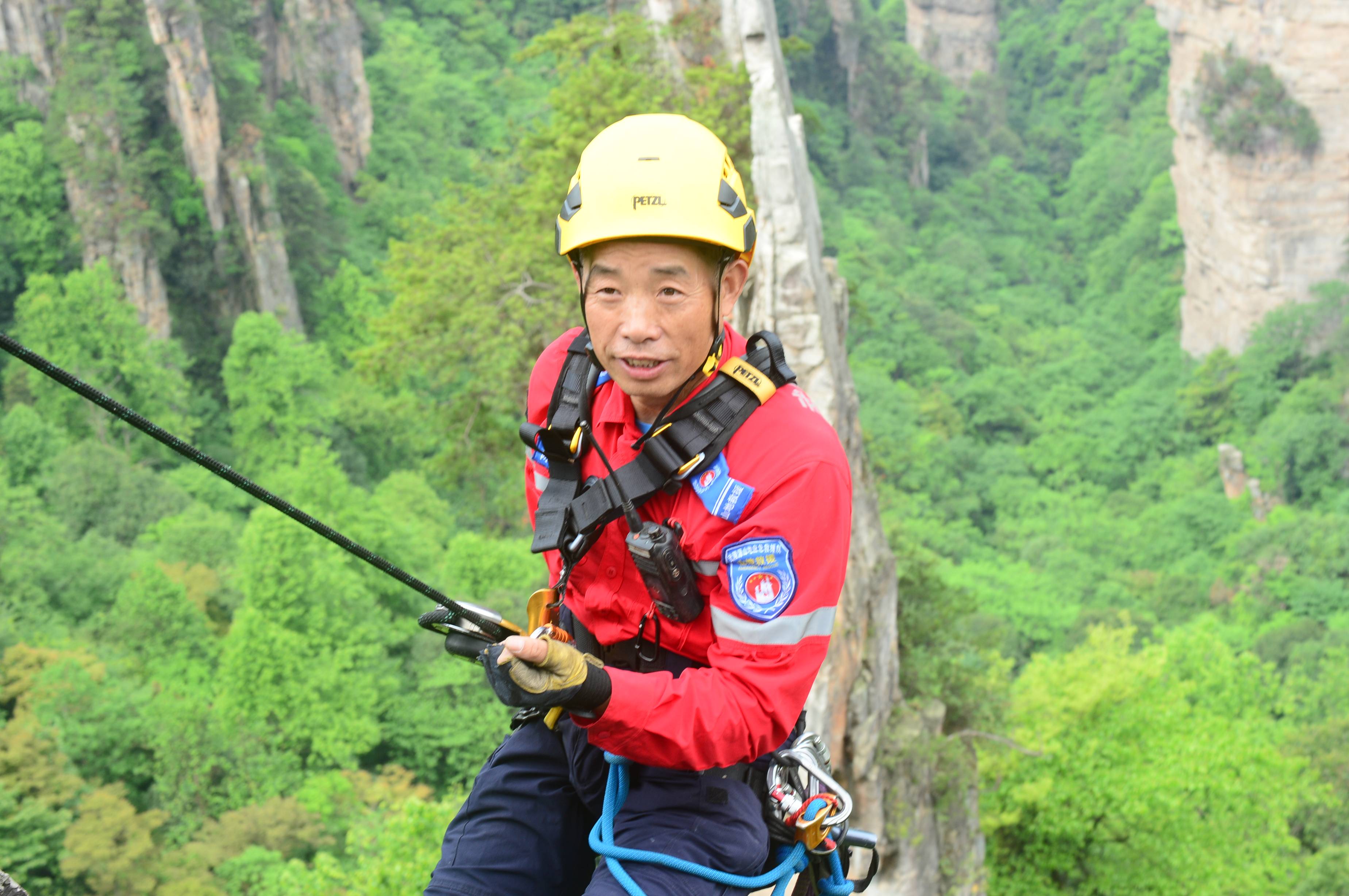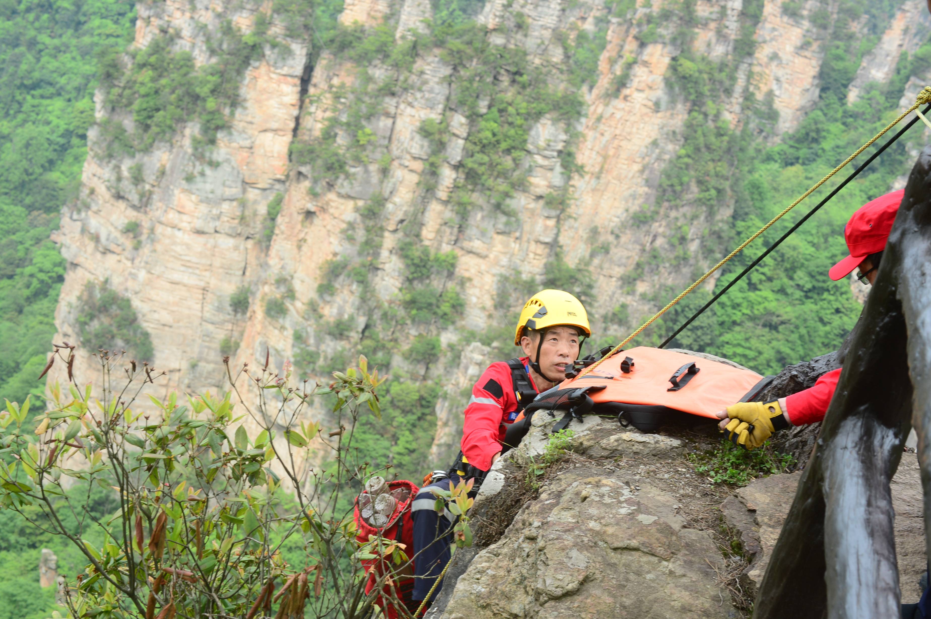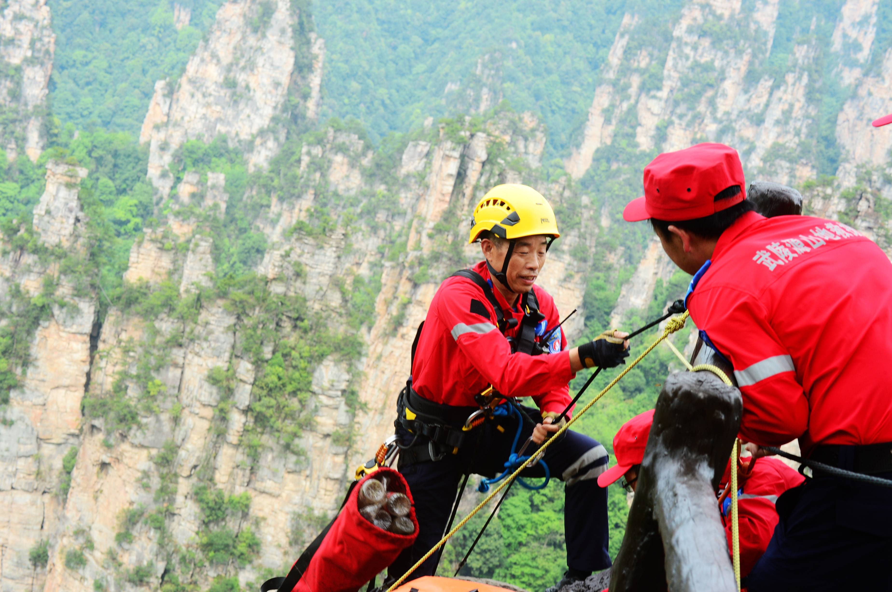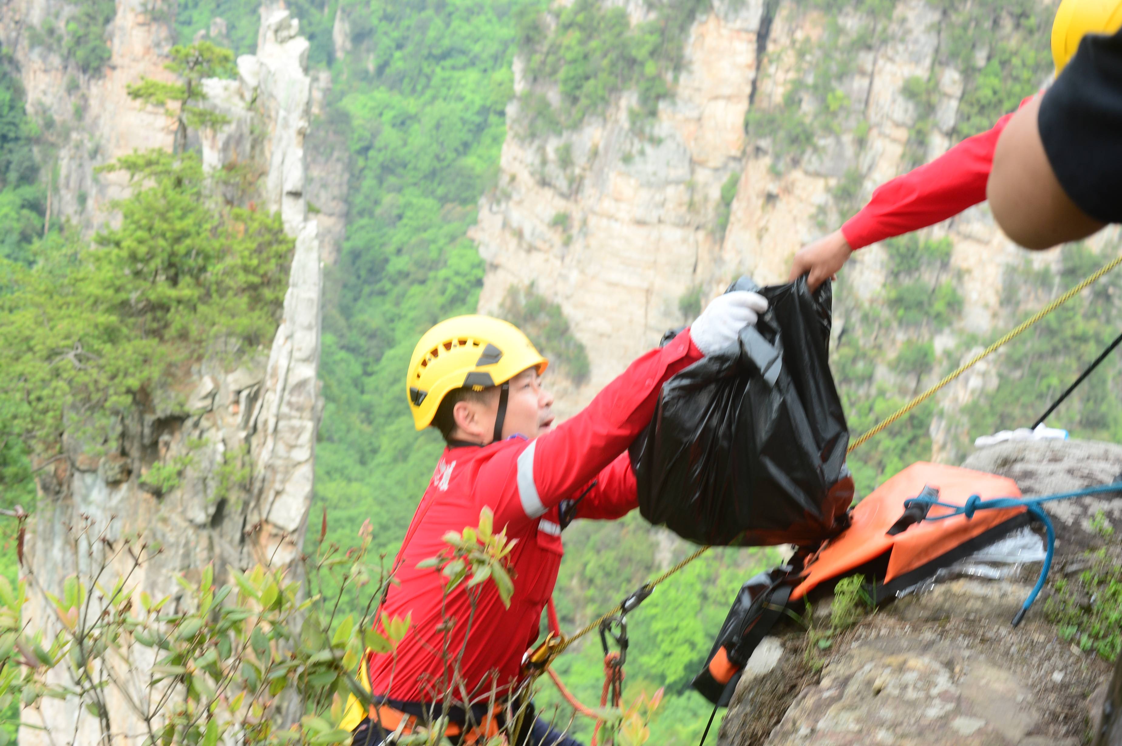 5月14日,湖南省张家界市。张家界国家森林公园天子山景区悬崖峭壁间,活跃着一批“红衣侠”。据了解,这批“红衣侠”共9人,为张家界市武陵源区山地应急救援队员,当天他们利用索降技术飞檐走壁,义务捡拾游客不慎丢失的垃圾,以实际行动保护世界自然遗产。 邓道理 摄