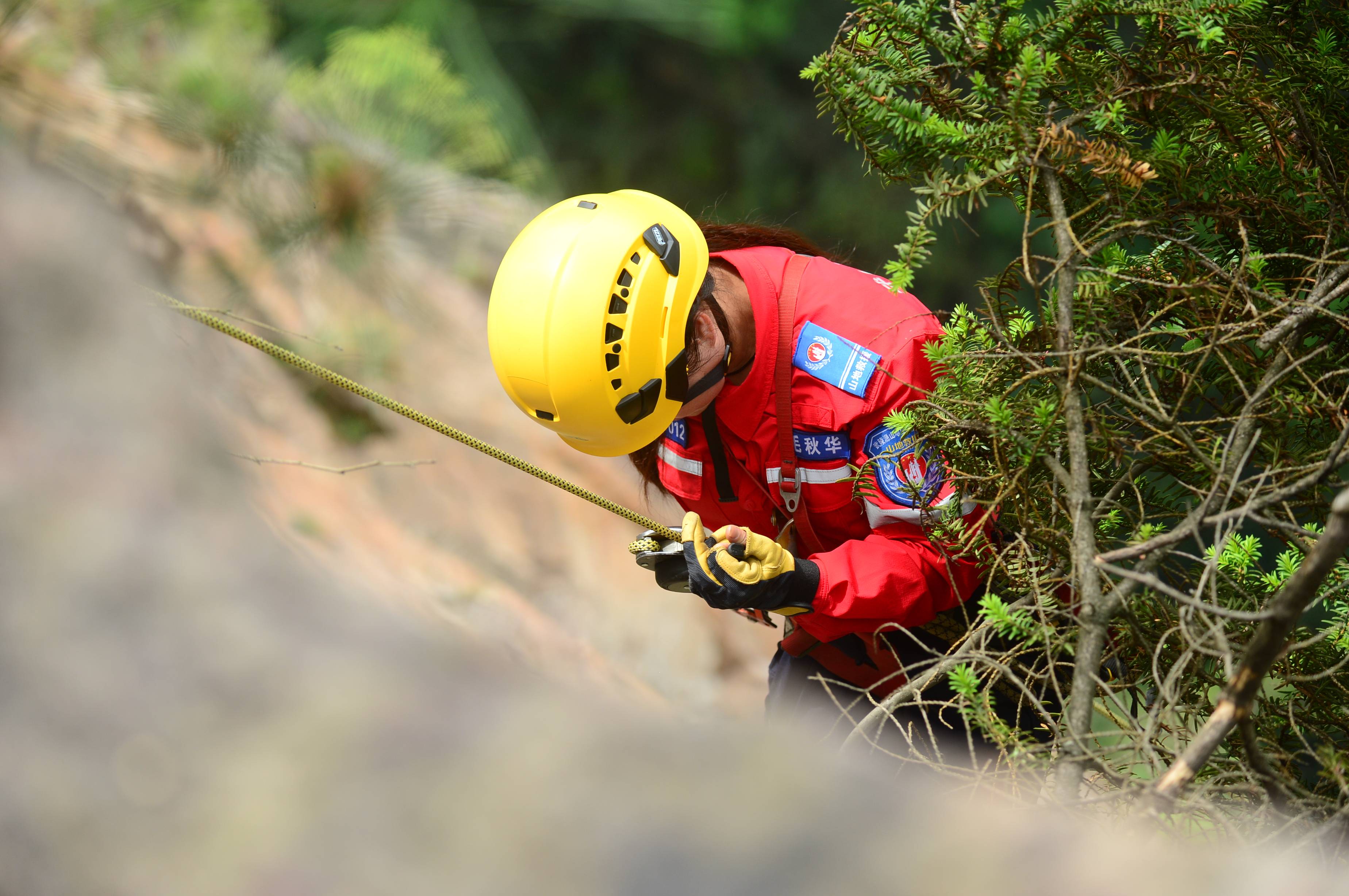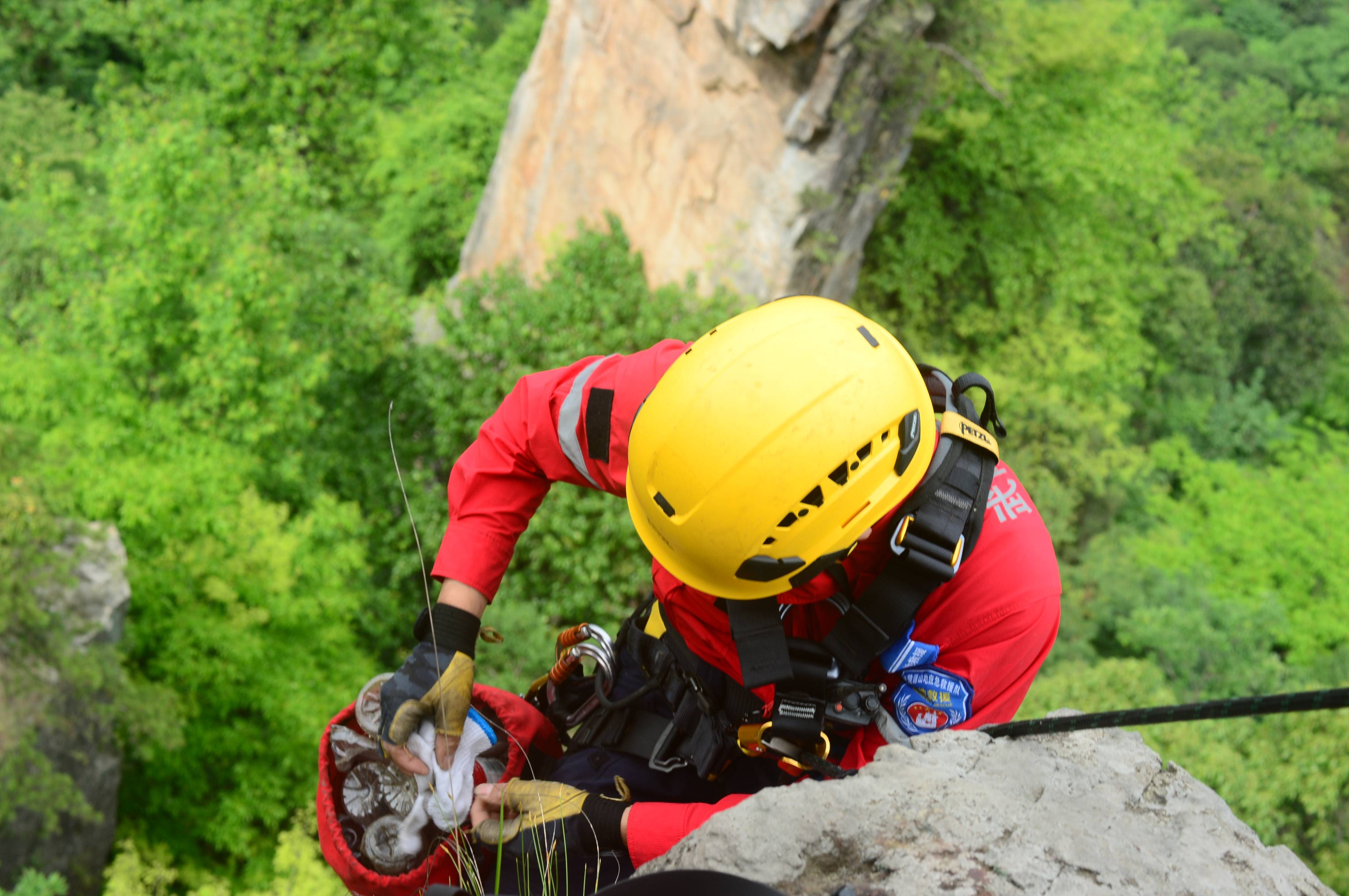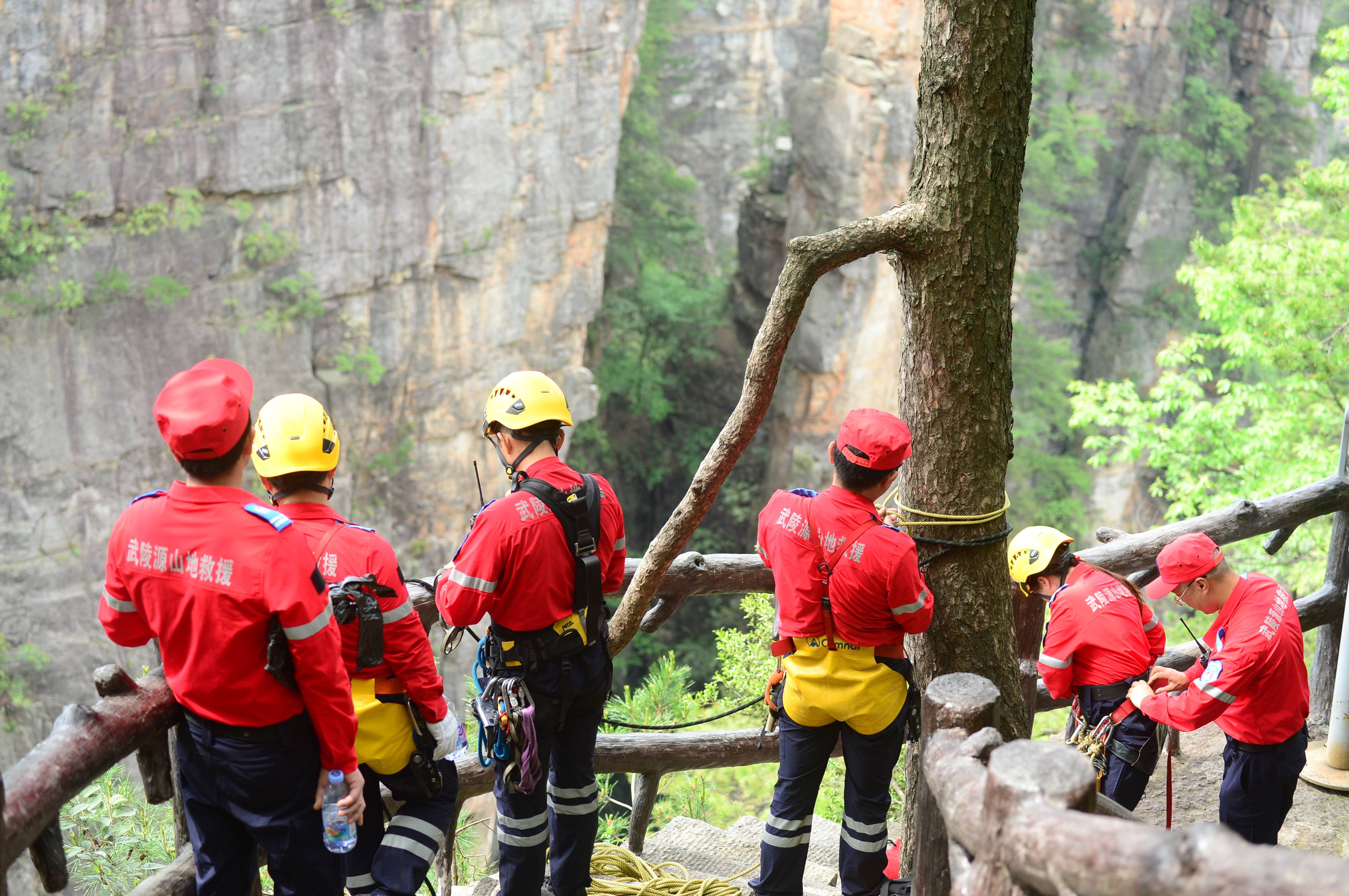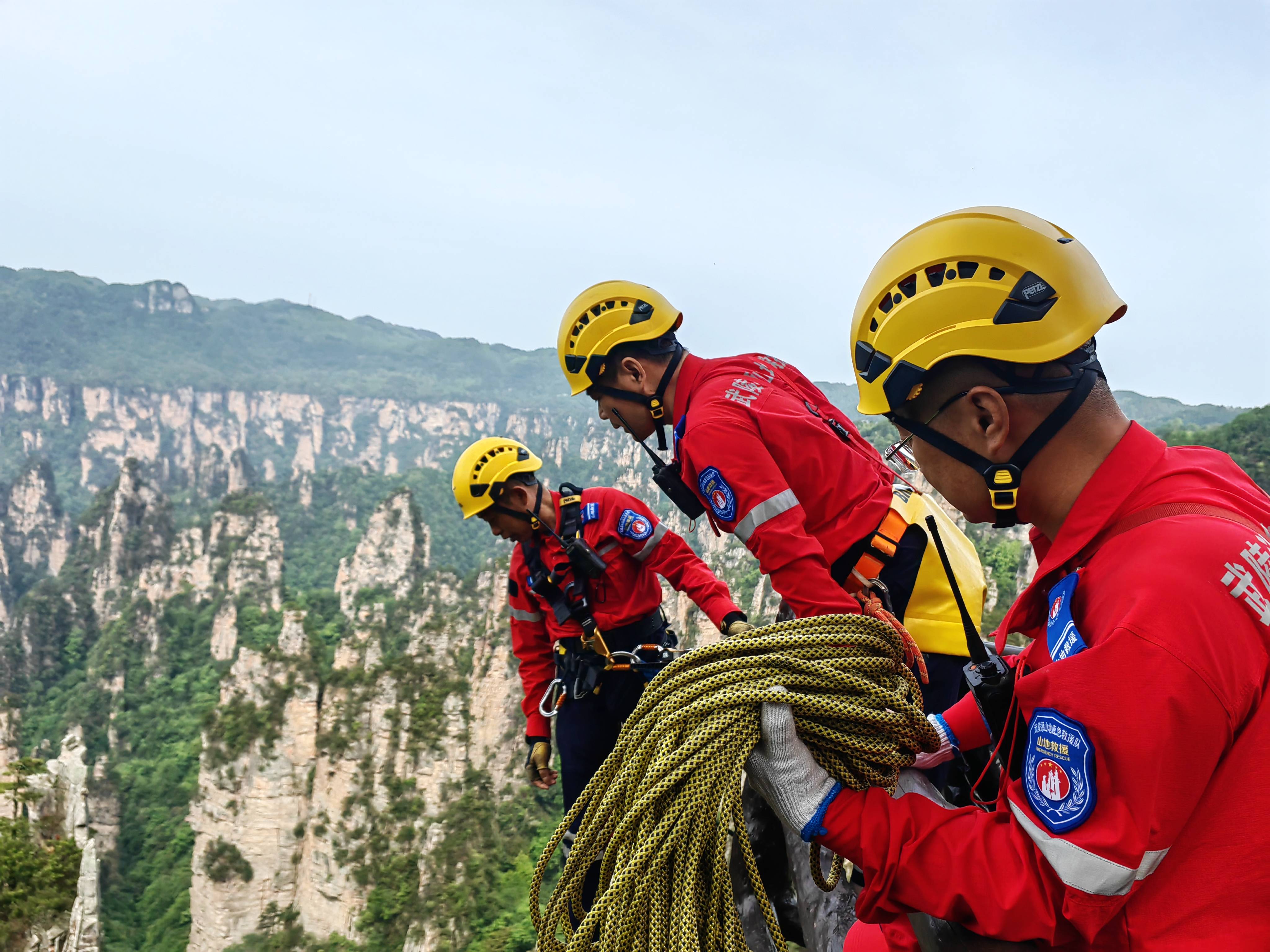 5月14日,湖南省张家界市。张家界国家森林公园天子山景区悬崖峭壁间,活跃着一批“红衣侠”。据了解,这批“红衣侠”共9人,为张家界市武陵源区山地应急救援队员,当天他们利用索降技术飞檐走壁,义务捡拾游客不慎丢失的垃圾,以实际行动保护世界自然遗产。 邓道理 摄