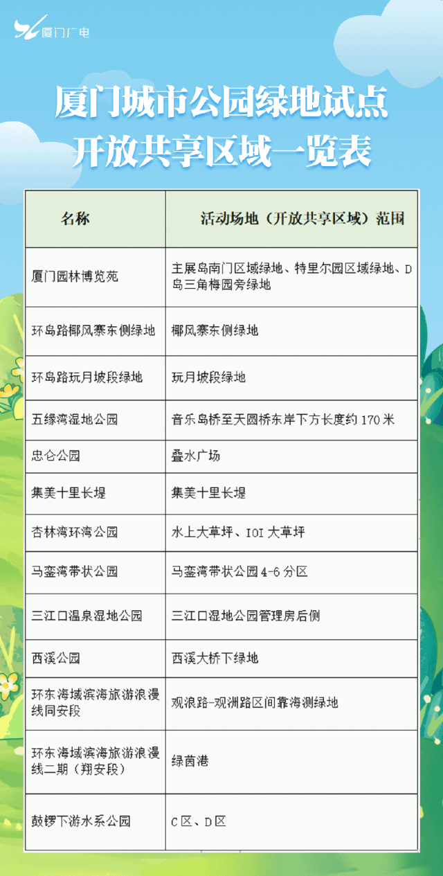 为更好地满足人民群众的户外活动需求,厦门市市政园林局积极探索开展城市公园绿地开放共享试点,制订了我市开展城市公园绿地开放共享试点实施方案,按照试点先行、积累经验、逐步推开的原则,积极推动开放共享试点工作,提升公园多元服务功能。