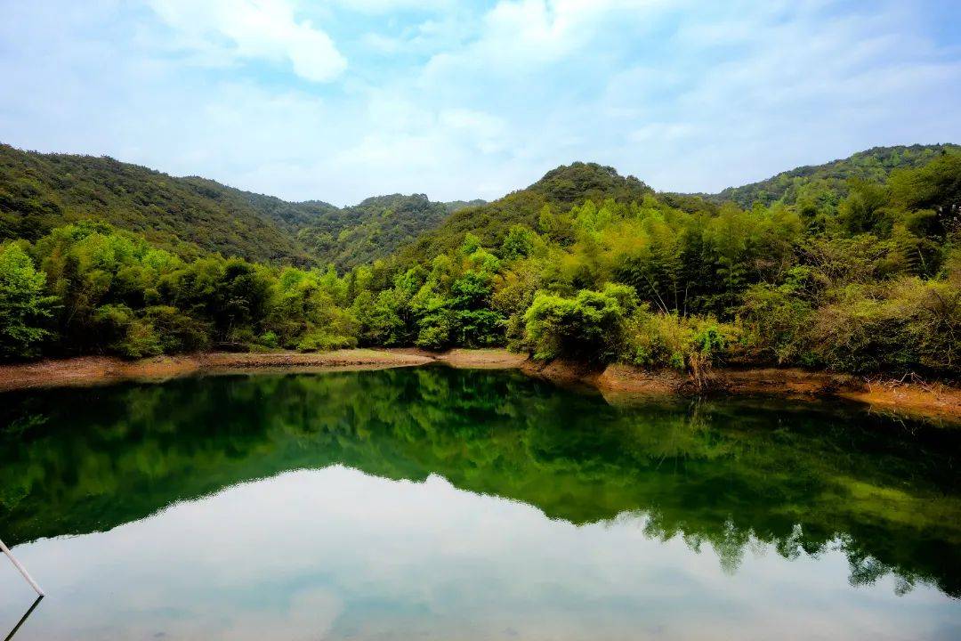 拾阶而上,山峦簇拥着一湖碧水,此水塘名为“岙里根山塘”,春日水平如镜,映着湛湛晴空,悠悠白云,水色天光遥相呼应,在眼眸中凝成一卷画图,教人忘却营营。