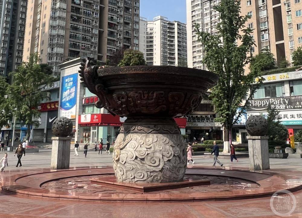 上游新闻记者看到,整座雕塑有一种厚实的分量感。据了解,九宫庙商圈自2008年开街以来,已成为重庆中心城区十大新兴商圈之一。相关负责人告诉记者:“聚宝盆寓意汇四面人气,聚八方资源,这正是商圈文化永恒的追求。聚宝盆不断往外涌出的水,犹如盆中满载的财富,象征源源不断的商业价值回报。夜间水中还会射出耀眼的光芒,流光溢彩。”