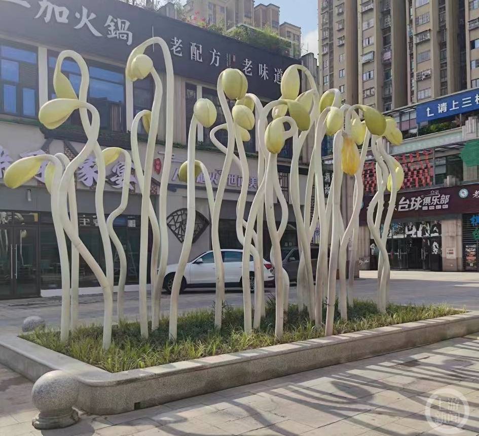 在上述网帖中,豆芽是网友们点赞最多的雕塑。5月16日,渝北区仙桃街道和睦路社区居委会相关负责人告诉上游新闻记者,网友提到的“豆芽”雕像,位于居易天城特色美食街(居易天街),雕像叫做新生旋律,象征着餐饮与少儿培训两个业态。