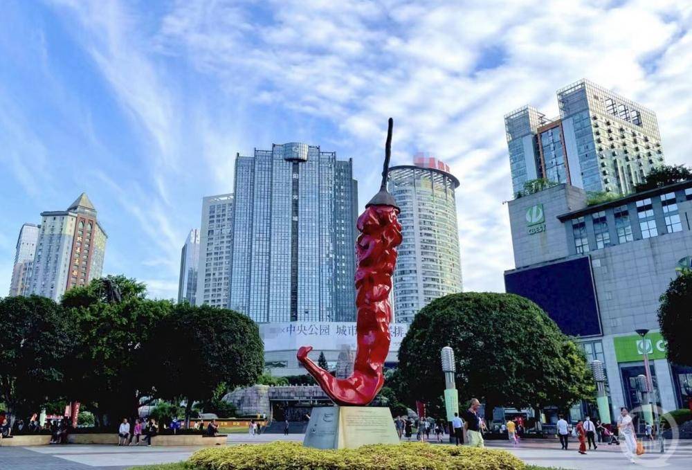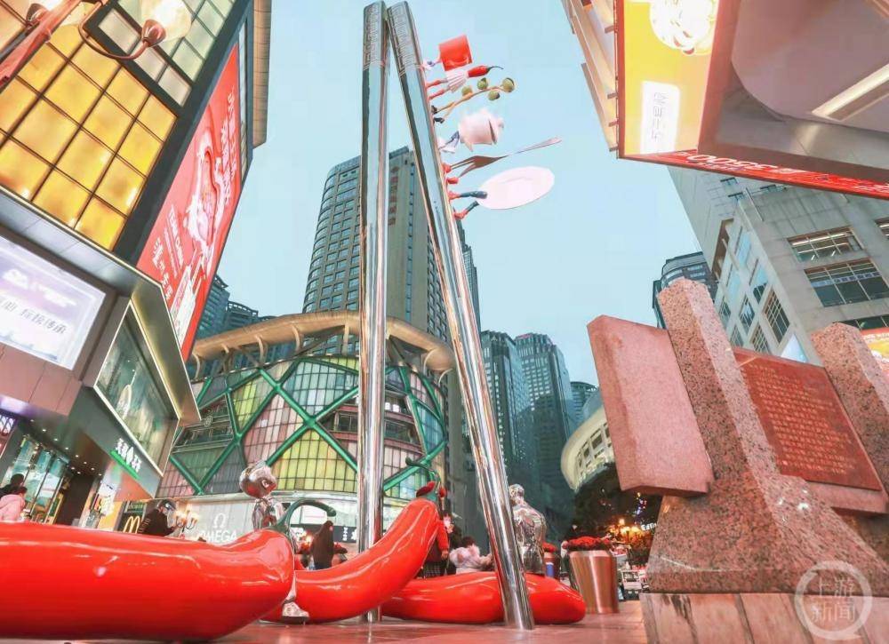一般吃火锅都要事先撒几个干海椒。位于江北区观音桥商圈的“干海椒”雕塑格外鲜艳吸睛。5月16日,江北区观音桥商圈管理办公室相关负责人告诉上游新闻记者:“该作品名叫天之椒子,出自意大利艺术家朱纸2014年重庆之行的灵感创作。铜铸着色的火红辣椒雕塑高6.25米,并在意大利2015年米兰世博会‘重庆日’活动上首次展出,同年该雕塑落地观音桥商圈。”