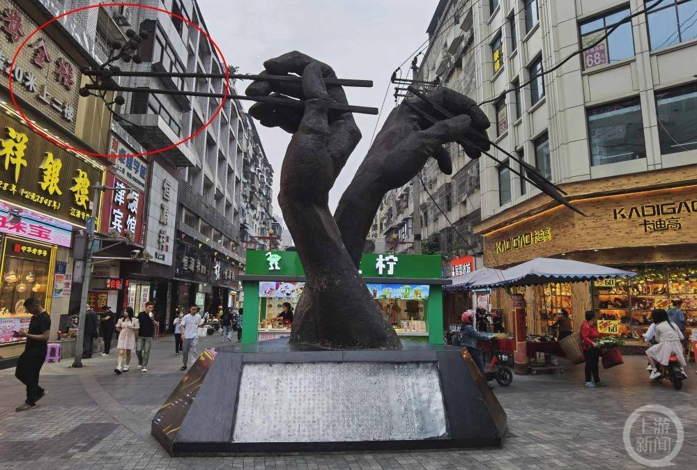 5月16日,解放碑CBD管委会相关负责人告诉上游新闻记者:“巨型银色筷子雕塑高约11米,是去年新亮相的八一路好吃街景观雕塑的一部分。雕塑在设计理念上参考了世界著名美食街的标志,旨在展现出区域特色和时代风貌。”