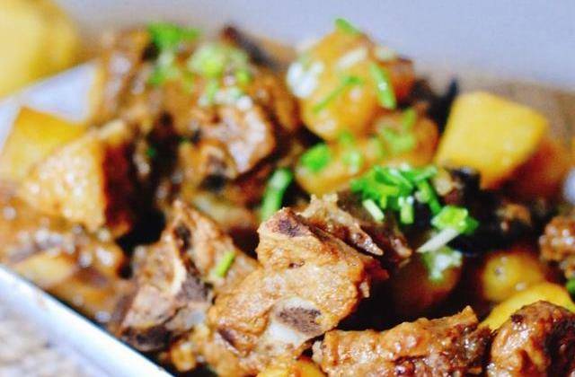 排骨土豆:锅里倒油,炸一下土豆,备用,然后放入香叶,花椒,八角,豆瓣酱,姜片爆香,倒入排骨翻炒,然后倒入料酒呛锅,再倒入适量生抽。接着加与排骨齐平的热水,放入葱和干辣椒小火焖30分钟,倒入翻炒过的土豆,再焖15分钟,加点冰糖,转大火收汁即可,完成特别香,排骨土豆都很软烂了,味道非常好。