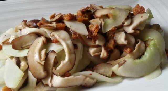 油渣香菇老黄瓜:香菇洗净切片,老黄瓜去皮一剖而,挖去籽切片。锅里下一点猪油,烧热后,油渣到进去略炒,起香后倒入香菇片翻炒。香菇炒软后加入老黄瓜片,翻炒至略熟,下盐,味精,迅速翻匀装盘。