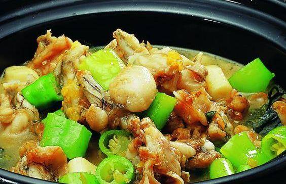 青椒焖牛蛙:牛蛙剁块备用。青椒切片待用。上油锅,下葱姜蒜翻炒。放入牛蛙翻炒,烹料酒。放入青椒翻炒,再放入鸡精、酒泡枸杞子翻炒。放入白糖、生抽兑入点清水,盖上锅盖焖一会儿。再放入盐调味,准备出锅。让吃者得到一份暖胃的享受。